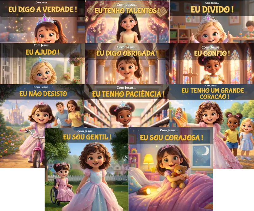 Crianças que sentem medo, enfrentam desafios e aprendem, com Jesus, a agir melhor em cada situação do dia a dia.